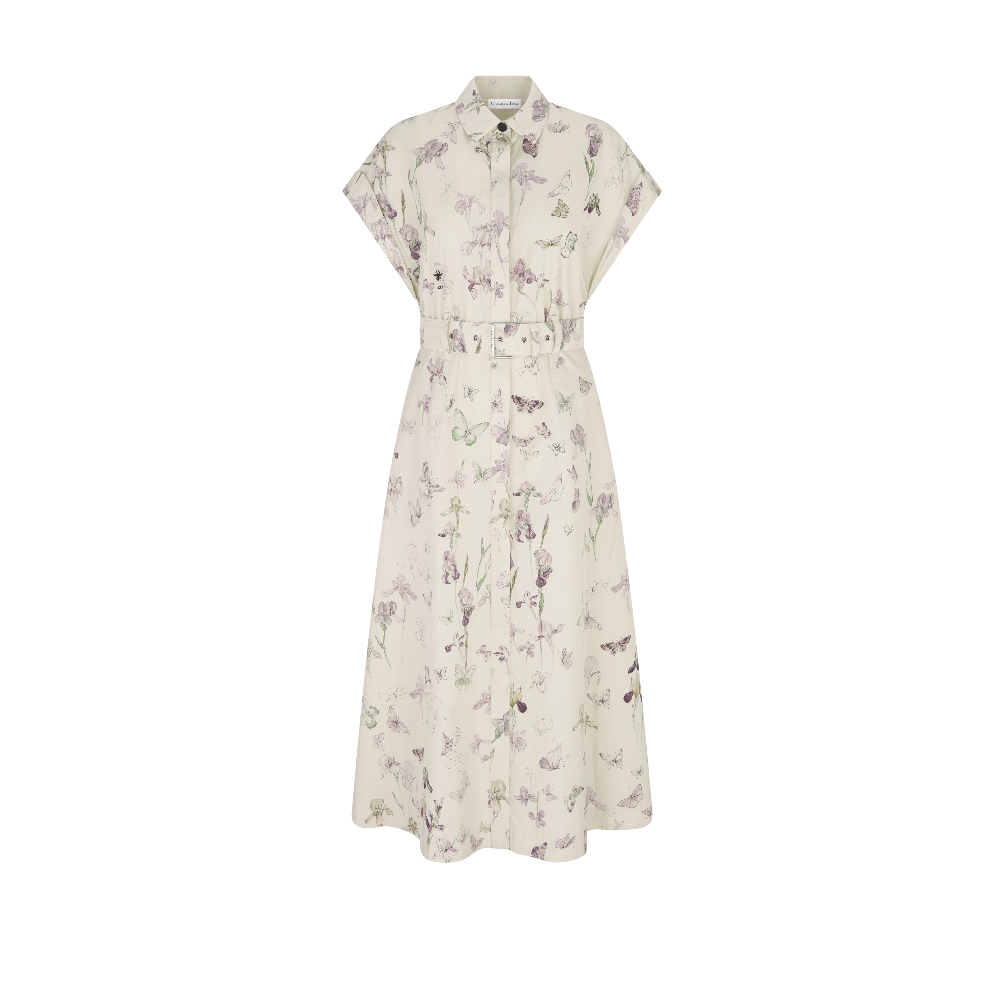 The mid-length shirtdress showcases a multicolor Butterflies & Iris motif, showcasing a soft watercolor effect suggesting an unfinished sketch, in a nod to the artistic spirit of the collection. Made in beige cotton and silk poplin, it stands out with an elegant flared silhouette and tonal belt highlighting the waist. Completed by cap sleeves, the dress can be paired with other Butterflies & Iris creations for a signature look. Embroidered hallmark bee and CD signature. Tonal belt with Christian Dior signature-engraved metal buckle. Concealed front button closure. Unlined. 68% cotton, 32% silk. Made in Italy