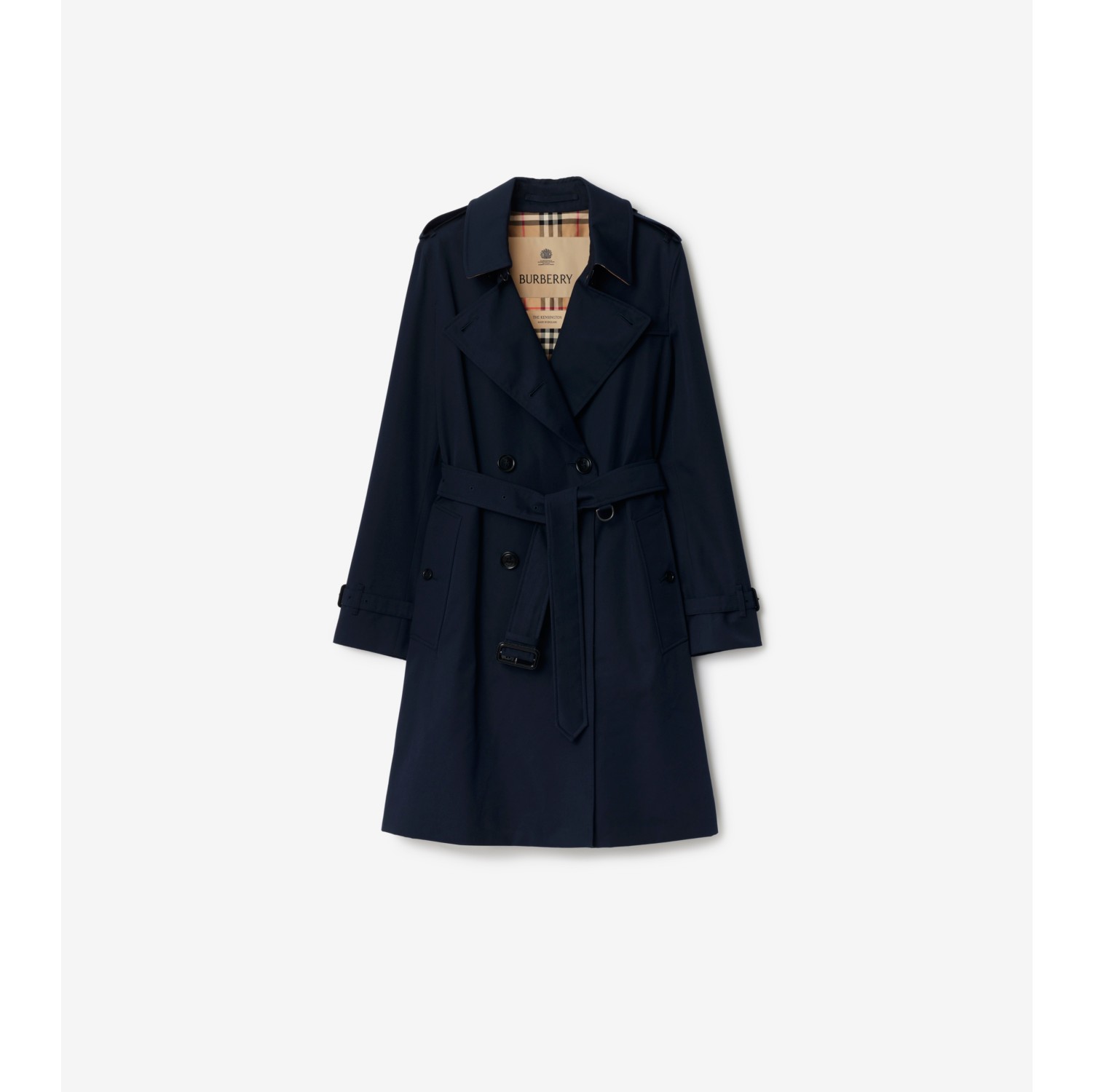 Defined by classic proportions, the Kensington trench coat is crafted for timeless elegance. Made in England from shower-resistant cotton gabardine, woven at the Burberry Mill, the coat is lined with the iconic Burberry Check and finished with heritage details. It is tailored to a regular fit with a structured shoulder, while added ease through the body allows for effortless layering. Double-breasted button closure Hook-and-eye collar closure Throat latch Epaulettes Storm shield at back Gun flap at shoulder Leather buckle belt and cuffs Side button welt pockets Back button vent Burberry Check lining and undercollar Comes with a garment bag
