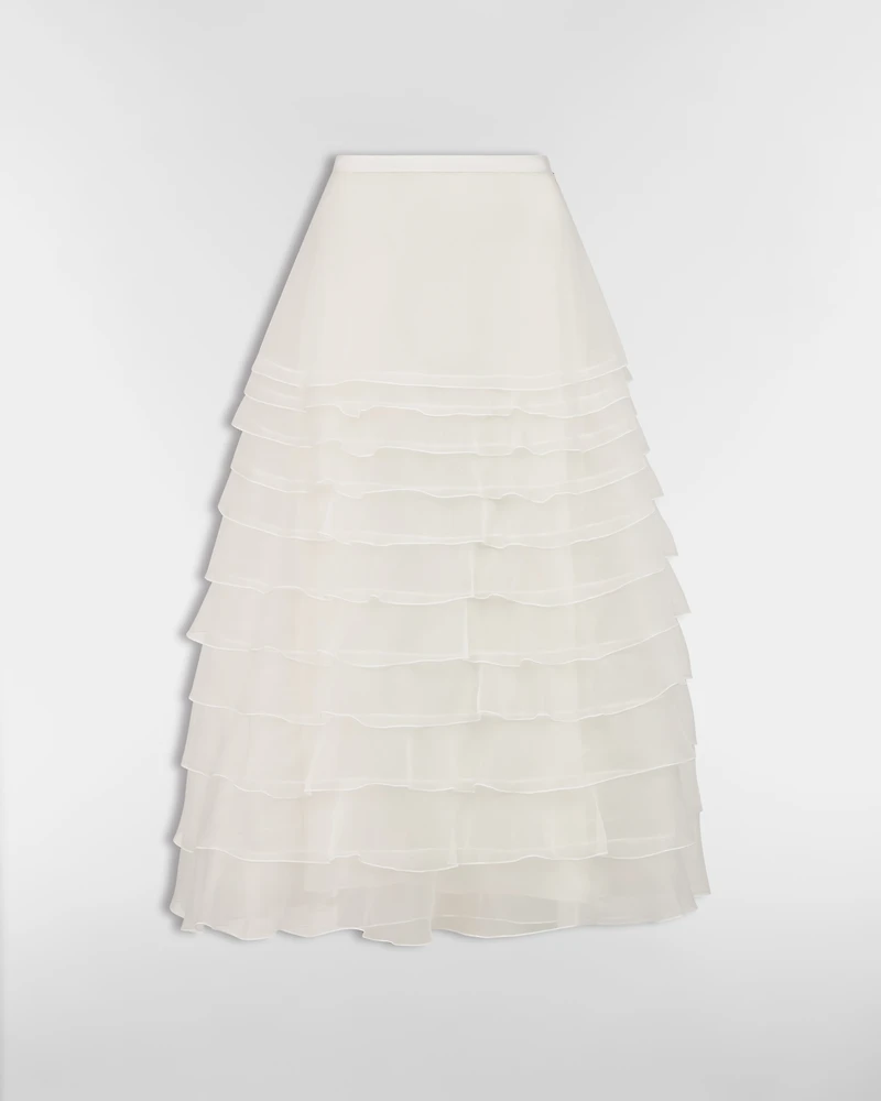 Unveiled at the Cruise 2026 Fashion Show and a signature Dior silhouette, the mid-length skirt is offered in an ethereal variation. Crafted in ecru silk organza, the design has a flared cut embellished with ruffled layers. The delicate and elegant skirt may be coordinated with a blouse from the season for a quintessential Dior look.