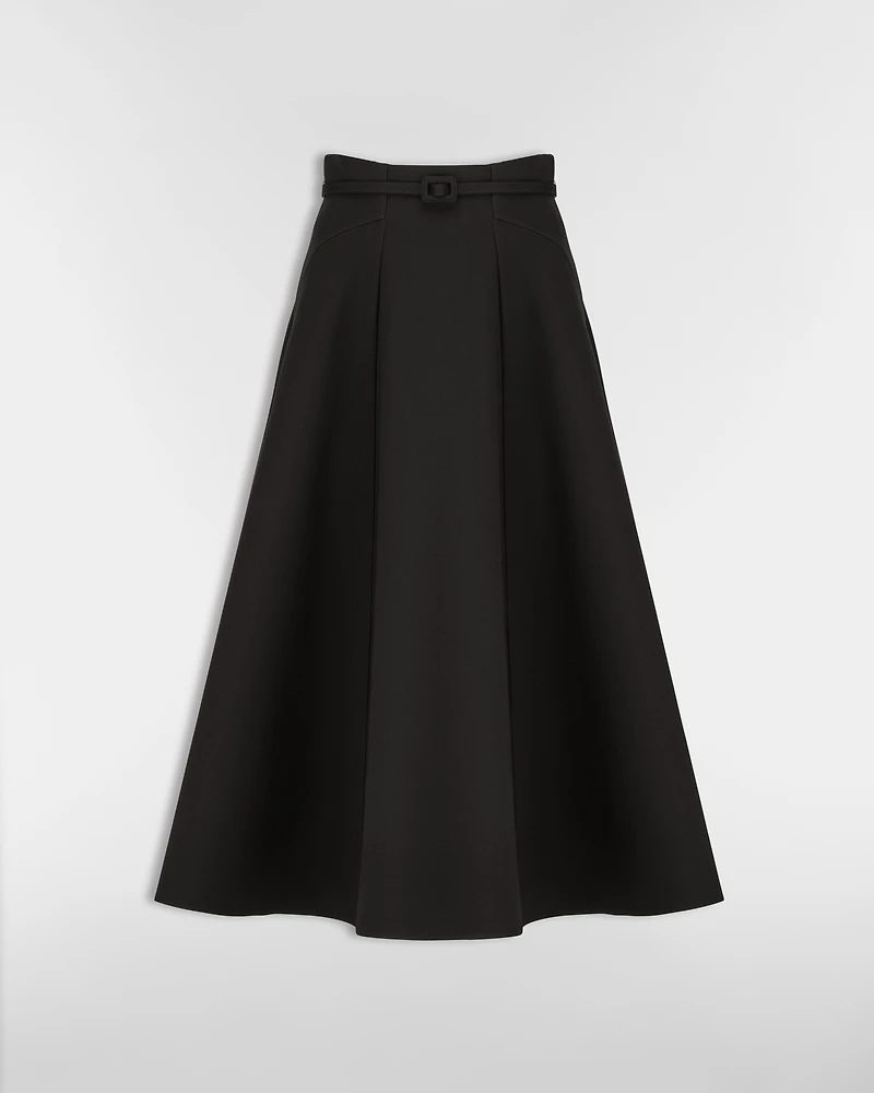 The mid-length skirt, a signature Dior silhouette, features a minimalist and elegant cut. Crafted in black wool and silk, its flared silhouette is enhanced by corsetry in tulle on the interior for added structure. The skirt can be coordinated with a seasonal blouse and the Macrocannage jacket for a hallmark look.
