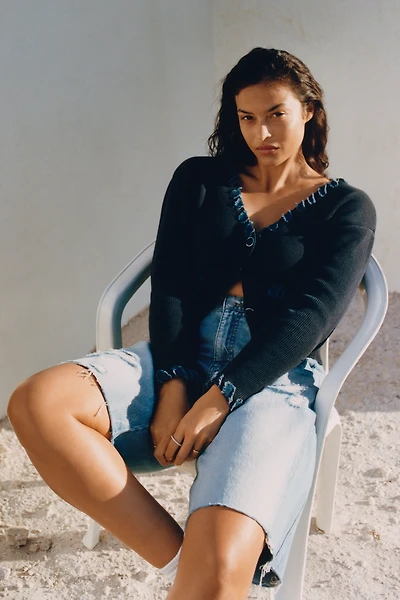 NVLT Denim-Trim V-Neck Cardigan Sweater