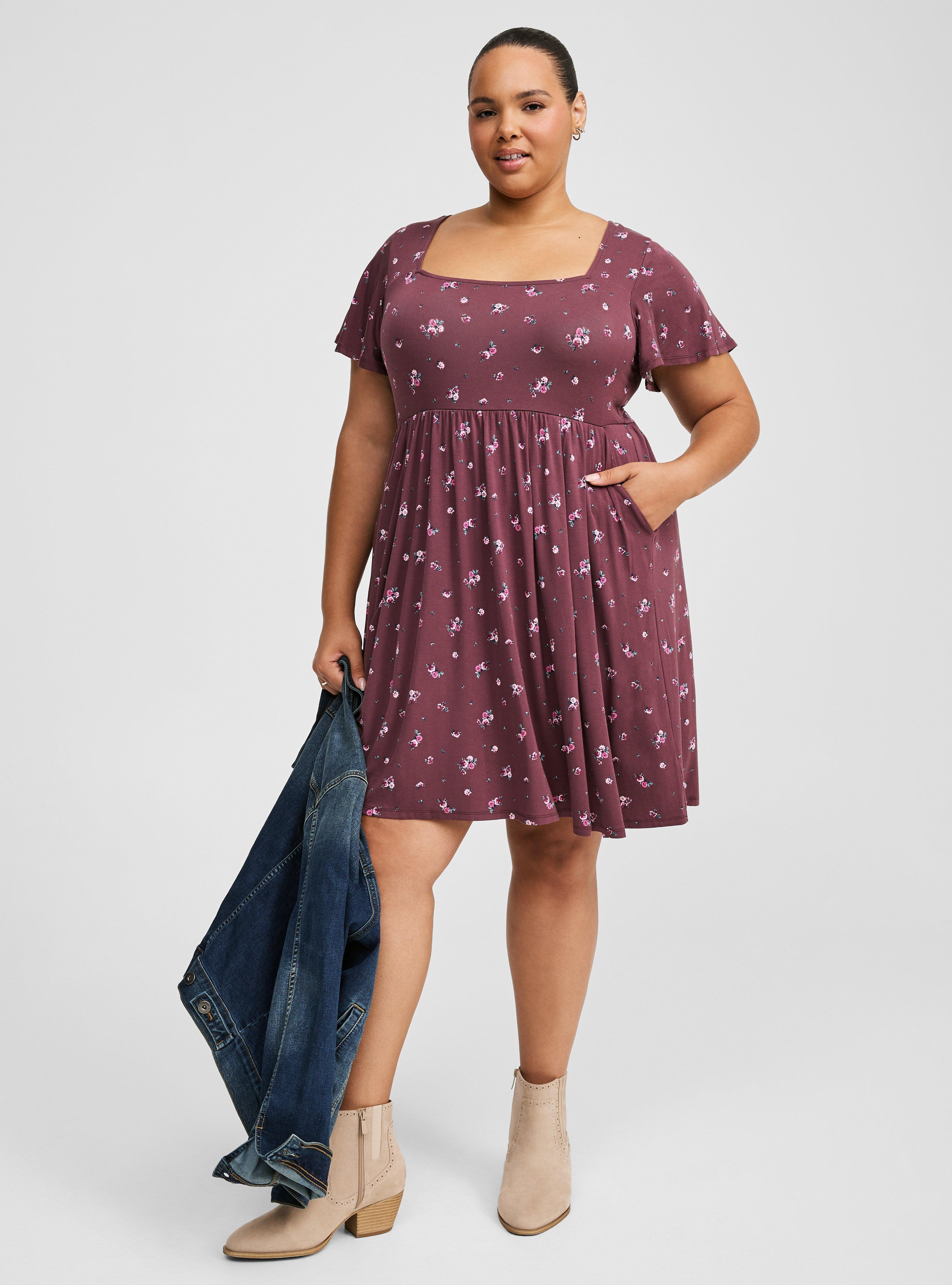 FIT Mini length. Skater silhouette. Measures 41'' from shoulder (size 2). MATERIALS + CARE Super Soft knit fabric: An incredibly soft, versatile knit that hugs close to the body. Stretch level: Maximum. 95% rayon, 5% spandex. Machine wash cold. Line dry. Imported. DETAILS Square neckline. Short flutter sleeves. Functional pockets.