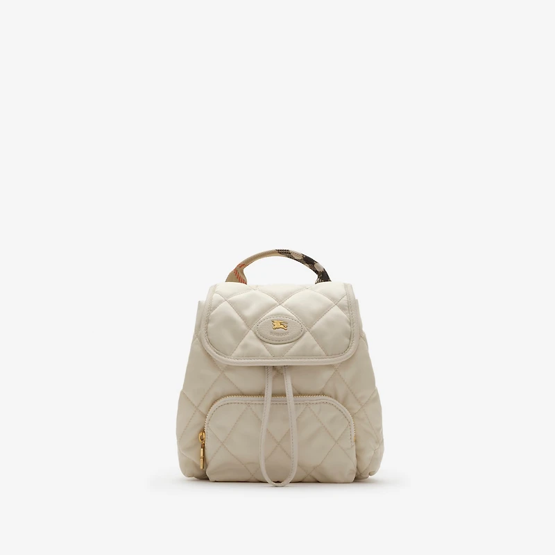 Inspired by country pursuits, the Horseshoe backpack is made from quilted nylon with Burberry Check webbing straps in our signature sand beige colourway. The compact design is detailed with leather trims and our Knight stamp, an archival motif first seen on Burberry bags in the 1980s. Use the D-ring at the side to personalise with charms. Webbing top handle Adjustable shoulder straps Foldover top with drawcord and magnetic closure Exterior zip pocket, interior slip pocket Brushed metal hardware Leather patch with Equestrian Knight Design at front Nylon lining Comes with a dust bag