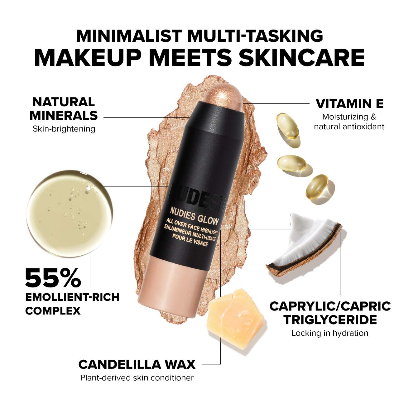 - 0.07 oz/ 1.8 g NUDIES Glow All-Over Face Highlight in Hey, Honey (golden glow)
