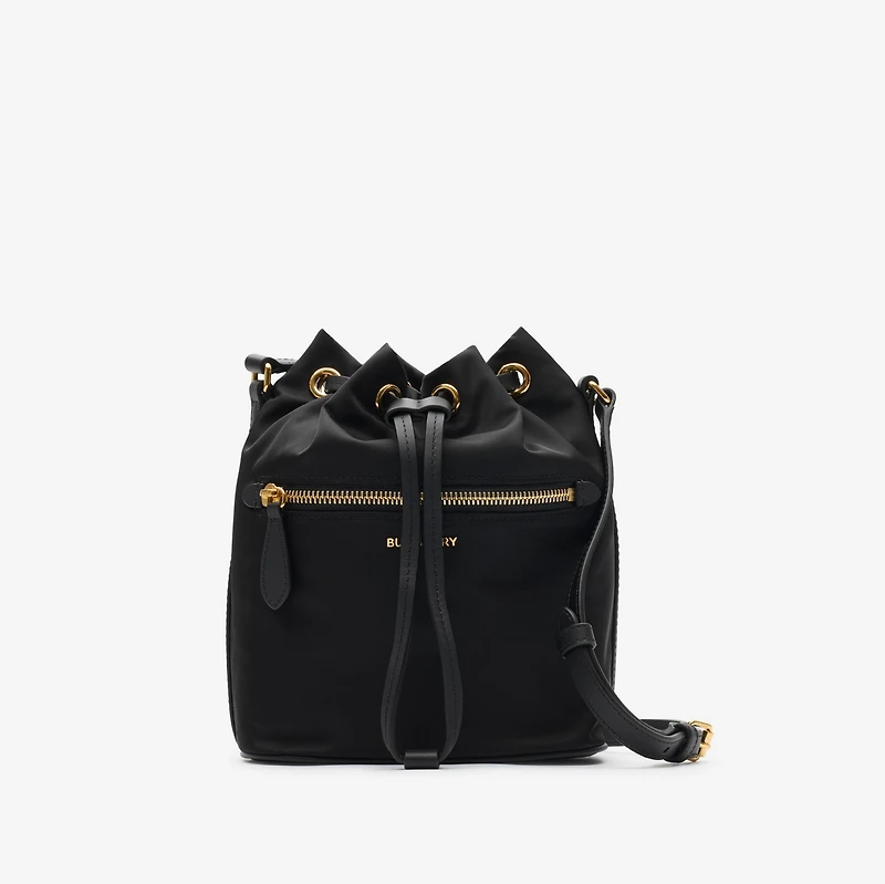 A compact drawcord pouch in nylon, trimmed with smooth leather. The style features an adjustable strap and is lined with the Burberry Check. Adjustable leather strap Drawcord closure Exterior zip pocket Polished metal hardware Raised Burberry lettering at front Burberry Check lining