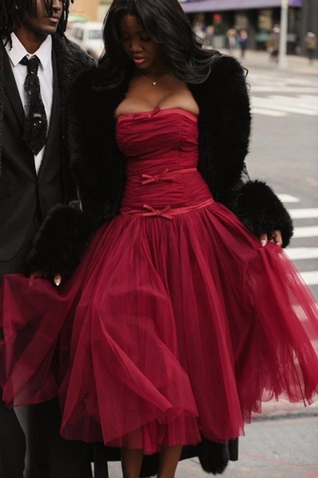 Miss Circle Women's Mabel Burgundy Drop Waist Layered Mesh Midi Puffy Dress with Bow