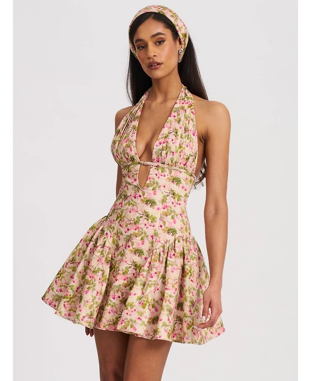 Miss Circle Women's Mackenzie Green and Pink Floral Print Halter Linen Mini Dress
