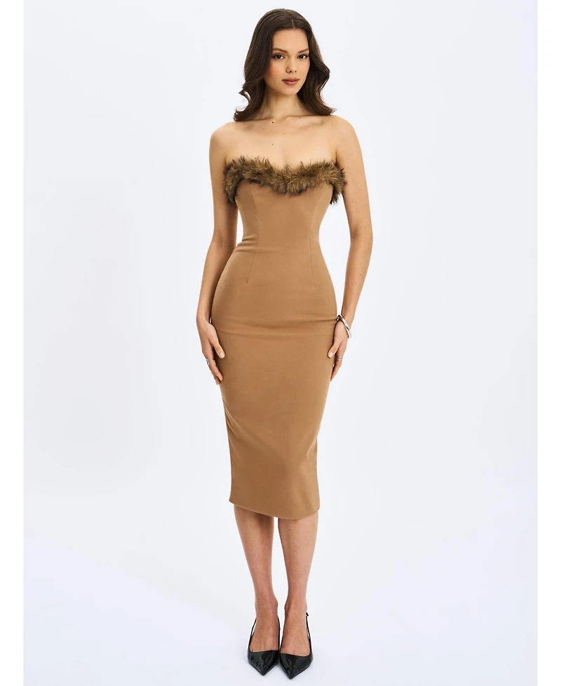 Introducing the Rayanne Dress, your cold-weather excuse to turn heads without breaking a shiver. Cut from brushed crepe in a decadent chestnut hue, this strapless maxi is topped with a plush fur trim along the sweetheart neckline for just the right dose of drama. Princess seams and boning in the bodice sculpt a figure to remember, while a back vent keeps your stride as smooth as your entrance. Fully lined in satin and finished with an invisible back zipper, it s the kind of dress that makes fireplaces jealous-perfect for holiday galas, candlelit dinners, and any night you want to warm the room before you even say hello.