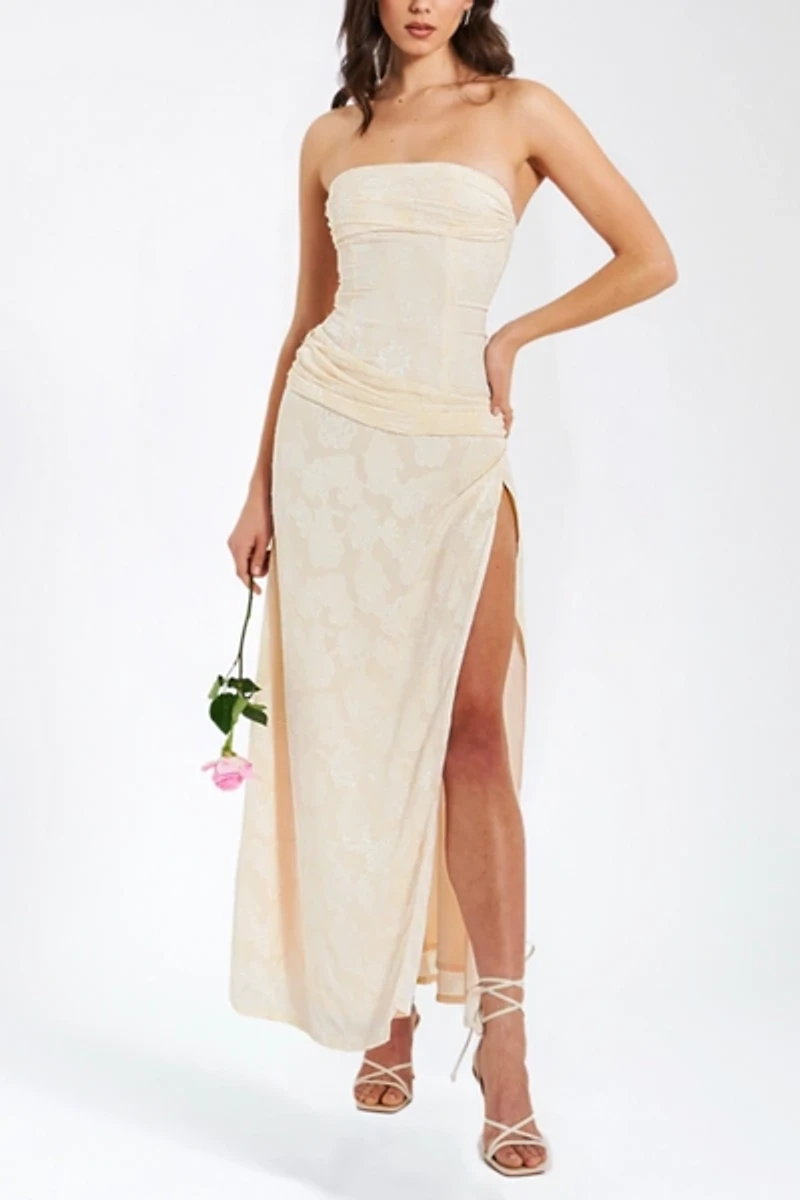 Introducing the Xatia – an exquisite strapless beige jacquard textured maxi dress that exudes elegance and sophistication. The ruched belt attached at the waist gracefully drapes asymmetrically to the hip, complemented by an overlapped thigh-high open slit at the side. Boasting two boned corset lines at the front bodice and a ruched panel at the bust with sticky tape on the neckline edge for added support, this chic maxi is perfect for black-tie parties, luxury weddings, dinner parties, red carpet events, galas, or any special occasion. Fully lined in satin and featuring an invisible zipper at the side seam, Xatia is exclusively available in beige.