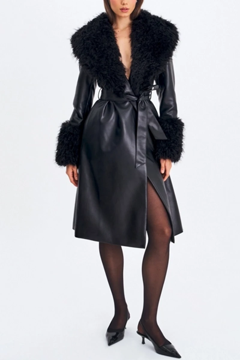 Meet your cold-weather power move—the Zariah Coat, a longline statement piece in sleek vegan leather with just the right amount of drama. Trimmed with plush faux fur at the neckline and cuffs, it delivers main character energy with every step. The overlapping front design pairs with a matching belt and secure belt loops to keep the silhouette cinched and polished. A luxe sateen-lined interior keeps things extra cozy, while exterior pockets add both function and flair. This is your go-to for winter days when you want to look fierce, feel warm, and turn sidewalks into runways.