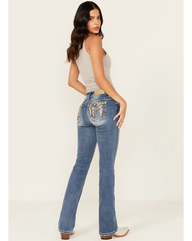 Miss Me Women's Medium Wash Dream Catcher Embroidered Mid Rise 32" Bootcut Stretch Denim Jeans