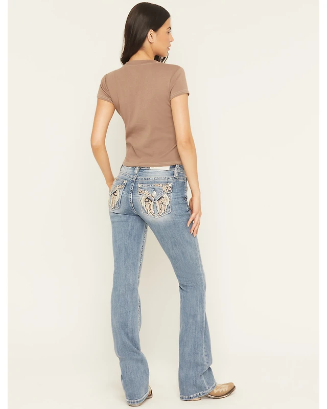 Miss Me Women's Light Wash Mid Rise Butterfly Pocket 34" Bootcut Stretch Denim Jeans