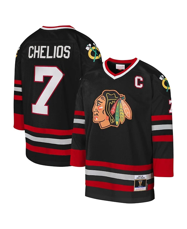 Mitchell Ness Youth Chris Chelios Black Chicago Blackhawks 1997-98 Blue Line Captain Patch Player Jersey