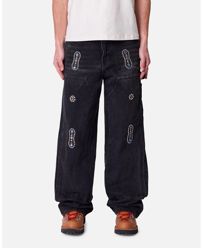 The mnml Ultra Baggy Western Jewel Jeans are unlike anything else in men's denim. Multicolored jewel applique and studded oval patches are scattered across the wide leg silhouette, turning each pair into a wearable art piece. Double knee construction adds durability where it counts, while a hammer loop and work pocket nod to workwear heritage. Constructed from 100% cotton with a vintage wash finish and a button-up close.