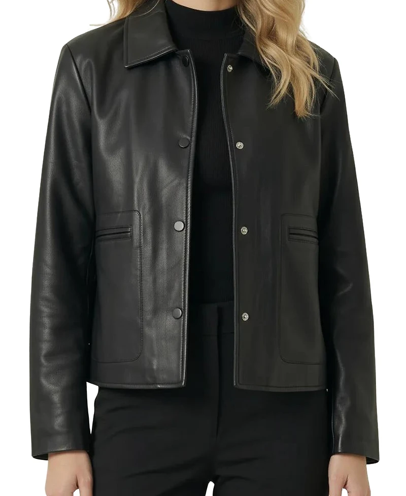 Modenaire Women's Leather Button-Front Collared Jacket