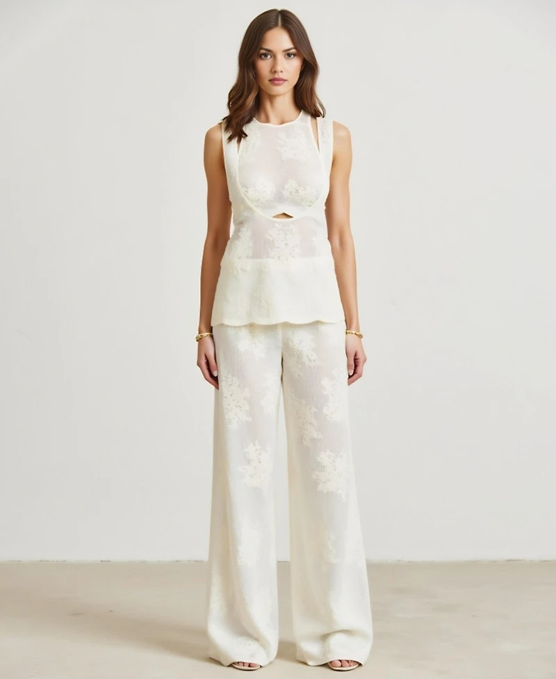 This elegant set pairs a sleeveless textured top with scalloped edges and a subtle front cutout, alongside sheer wide-leg pants adorned with delicate floral motifs. The coordinated pieces offer a graceful, lightweight look.