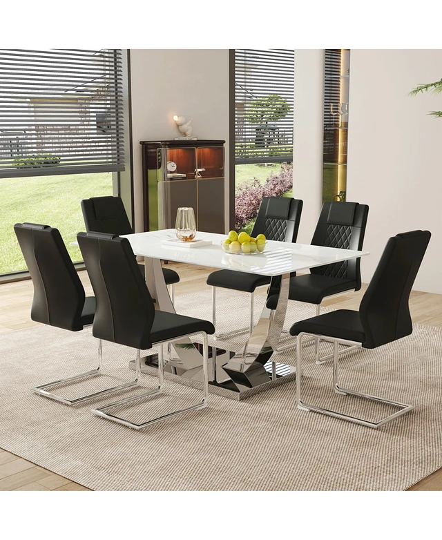 Streamdale Modern Marble Dining Set Table (55"x31.4") + 6 Black Pu Chairs
