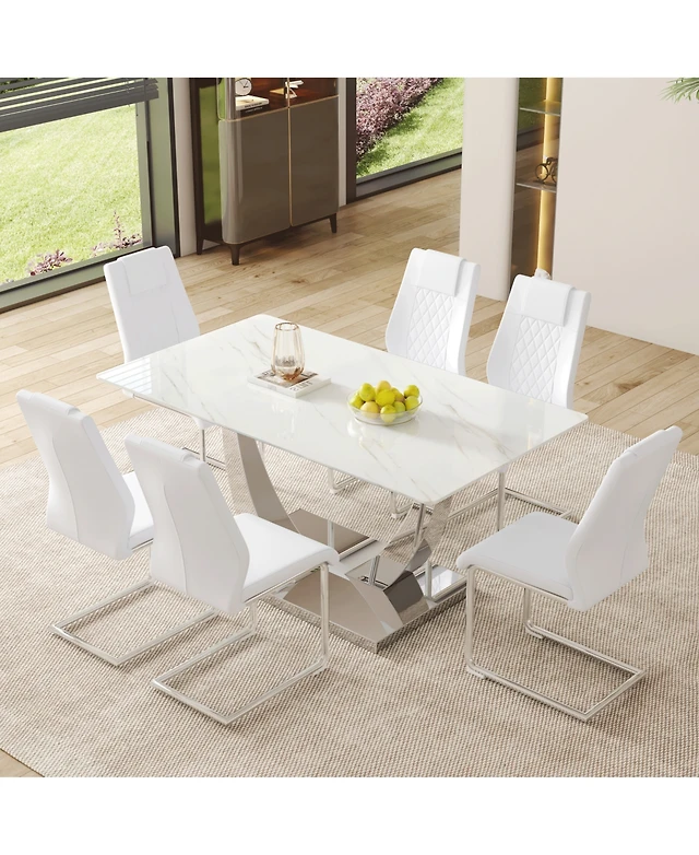 Modern Glass Dining Set: Marble Top Table & 6 White Pu Chairs