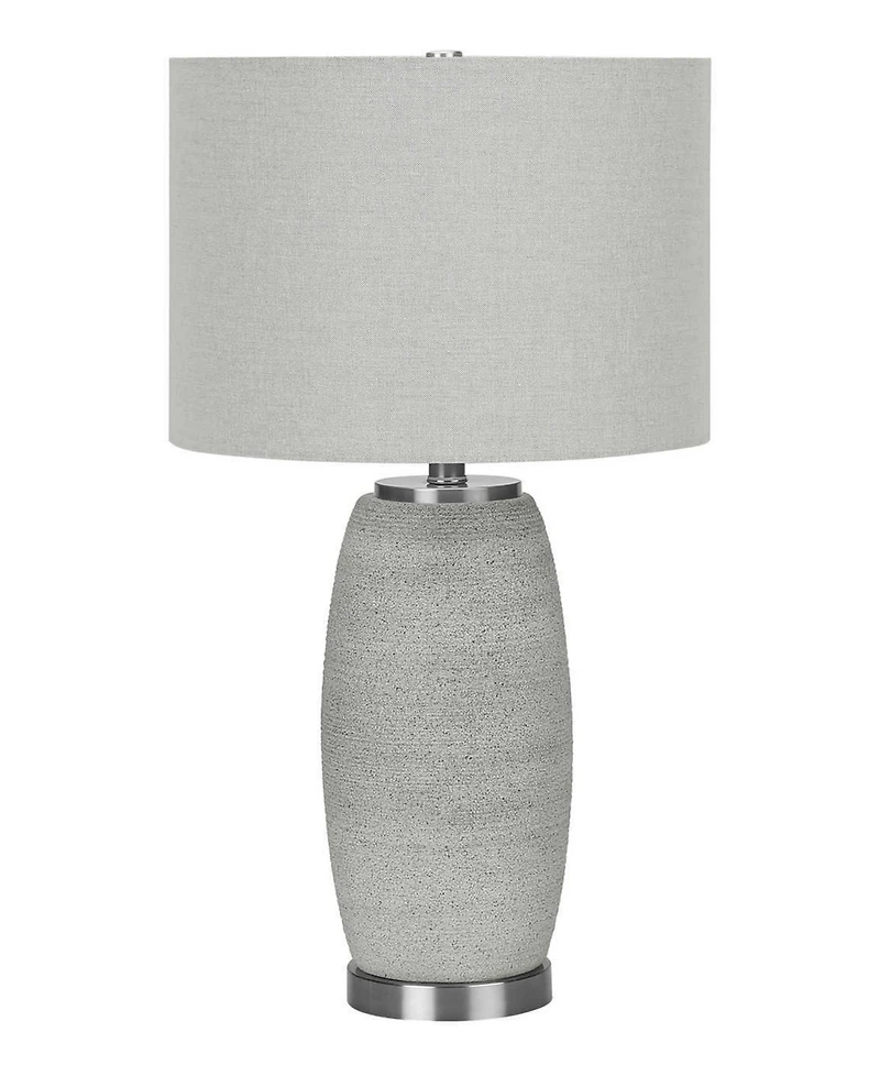Bring some modern fashionable style to any room with this 25"" table lamp. A beautiful blend of a textured gray ceramic vase shaped base accented with a polished silver footing, gray linen drum shade, and finished with a silver metal finial on top.