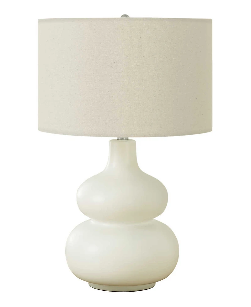 Create a fashionable ambiance with this stylish 25"" table lamp. Designed with a modern, curvaceous cream ceramic base and an ivory linen fabric shade, this lamp will brighten up any space while adding a decorative accent to your office, living room, or bedroom.