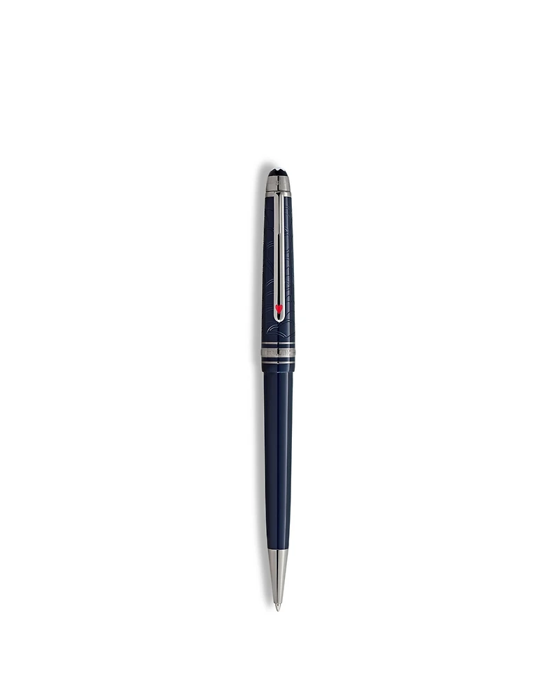 The Meisterstuck Around the World in 80 Days collection draws its inspiration from Jules Verne's renowned adventure novel. The Classique Ballpoint, adorned in dark blue precious resin, recounts the epic journey of Mr. Fogg and Passepartout. Embarking on the final leg from Yokohama back to London via the United States, the duo traverses the vast American continent by train. Delve into the intricate details – a train elegantly lasered on the cap, a safety chain pattern on the cone, mirroring a pivotal moment when Passepartout detaches the train from the locomotive to save the crew who was attacked by Sioux.The cap's design captures pressure valves and the billowing smoke of the locomotive, while the clip boasts a red lacquered heart card suit, symbolizing the union between Phileas Fogg and Princess Aouda. Additionally, card suits represent Fogg's daring wager to complete the journey in a mere 80 days. The cap top bears the embossed timeline of the journey – 36 days from Yokohama to London, culminating in the grand total of 80 days around the world.