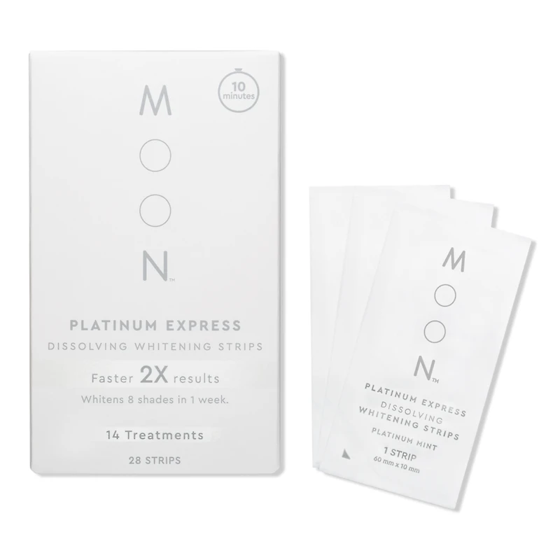 PLAT EXPRESS DISSOLVING WHITENING STRIPS. Benefits: MOON's most advanced dissolving whitening strip with 2x faster results for express whitening. Powered by Hydroxyapatite for gentle enamel protection during whitening. Clinically proven to whiten teeth up to 8 shades in 1 week. Formulated Without: Parabens. Animal Products. Phthalates. Triclosan. Sulfates. Artificaial Flavors. :