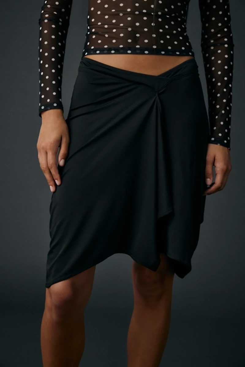 Slinky jersey knit Motel skirt in an on-trend knee length silhouette. Midi skirt designed with a low-rise v-shape waistline, asymmetrical wrap front and ruffled hanky hem. Pairs perfectly with tanks, blouses and knits to switch up your vibe.