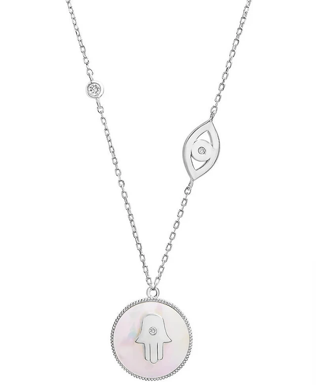 Mother-of-Pearl (10mm) & Cubic Zirconia Hamsa Hand & Evil Eye Pendant Necklace in 14k Gold-Plated Sterling Silver, 16" + 2" extender