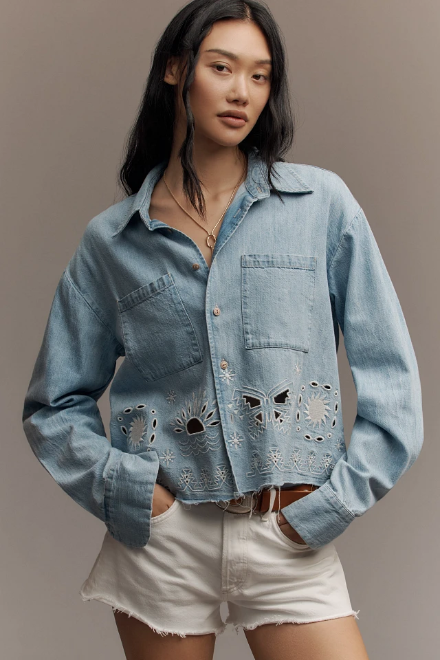 MOTHER The Roomie Double Frenchie Crop Fray Buttondown Shirt