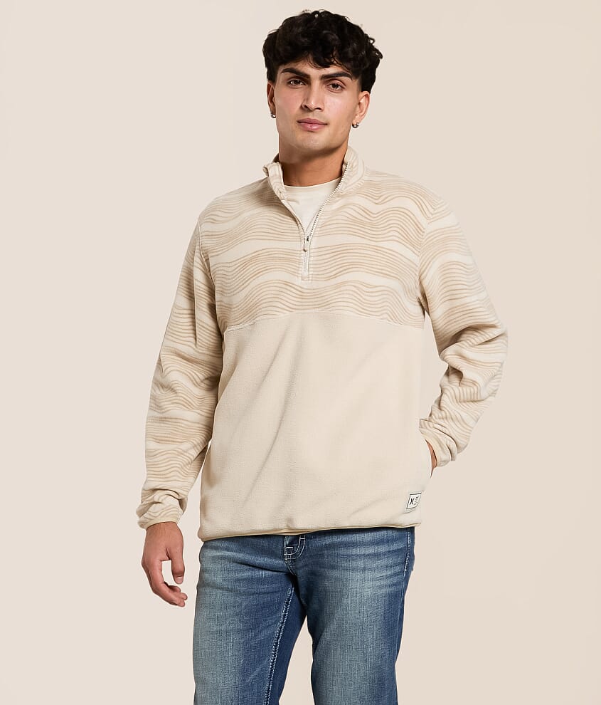 Striped fleece mock neck quarter zip pullover Side seam pockets Elasticized hem and cuffs