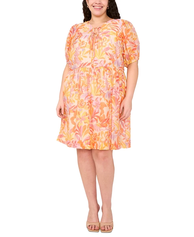 Msk Plus Printed Tie-Neck Short-Sleeve Dress