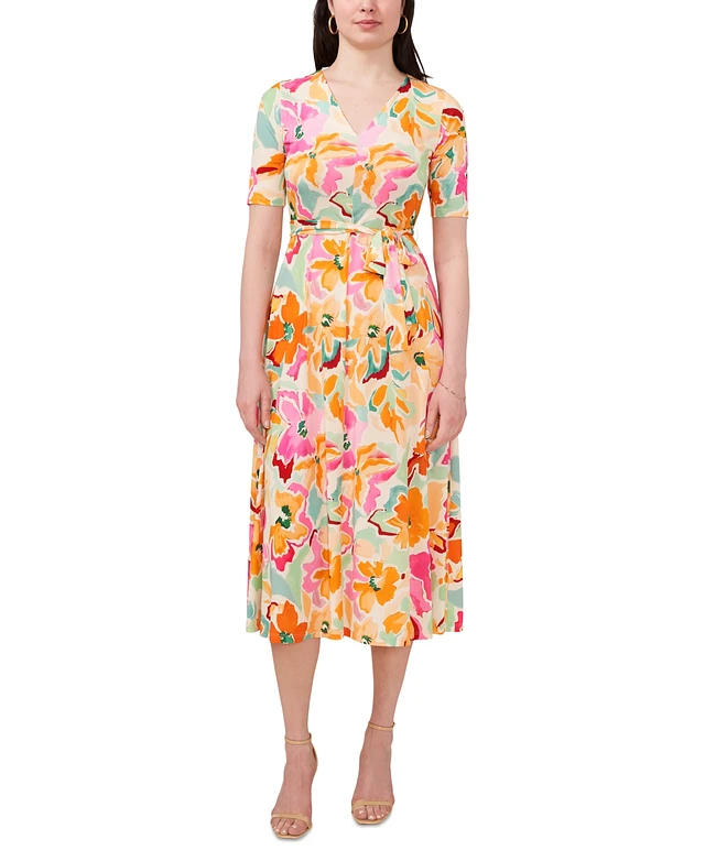 Msk Women's Floral-Print Tie-Waist V-Neck Midi Dress