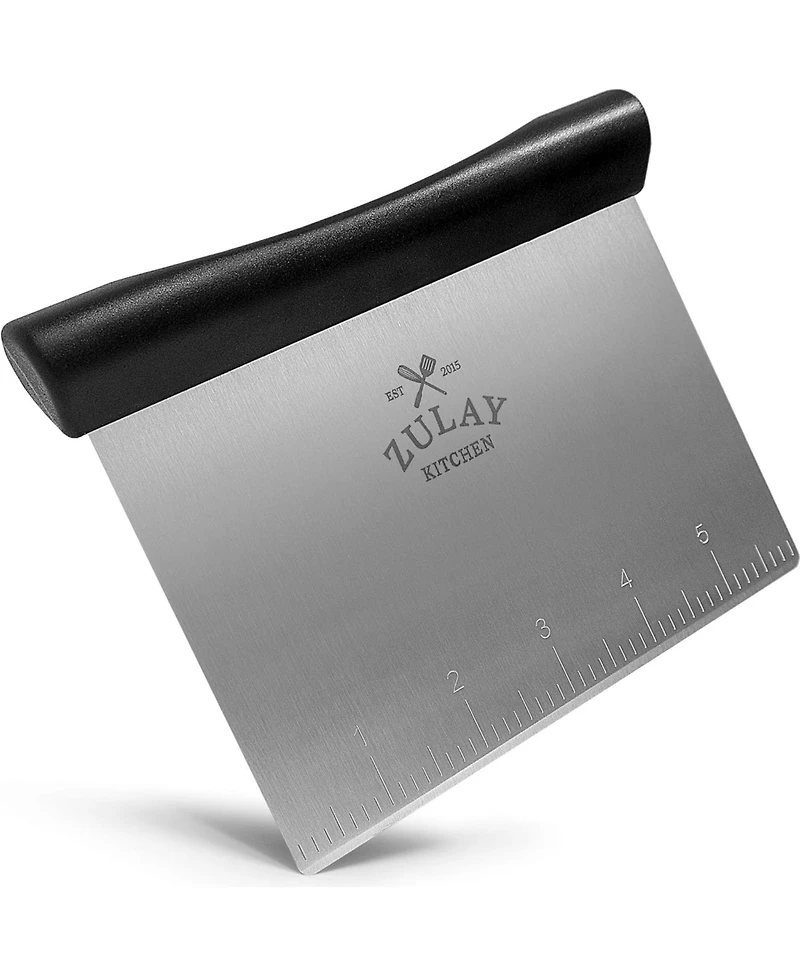 Upgrade your kitchen prep with the Zulay Premium Multi-Purpose Stainless Steel Bench Scraper & Chopper, a versatile tool designed for precision and convenience. Made from high-quality stainless steel, this durable scraper resists rust, bending, and corrosion, delivering long-lasting performance for everyday baking and cooking tasks. The wide, sturdy blade makes it easy to cut and portion dough, divide pastry, scrape countertops clean, and transfer chopped vegetables from board to pan in one smooth motion. Clearly etched measurement markings along the blade provide quick, accurate sizing for perfectly even cuts every time, ideal for bread, pizza, pasta, and dessert dough. Its ergonomic, non-slip handle offers a comfortable, secure grip, giving you full control while chopping or scraping. Easy to clean and dishwasher safe, this multi-use dough scraper and chopper is an essential tool for home bakers and professional chefs alike.