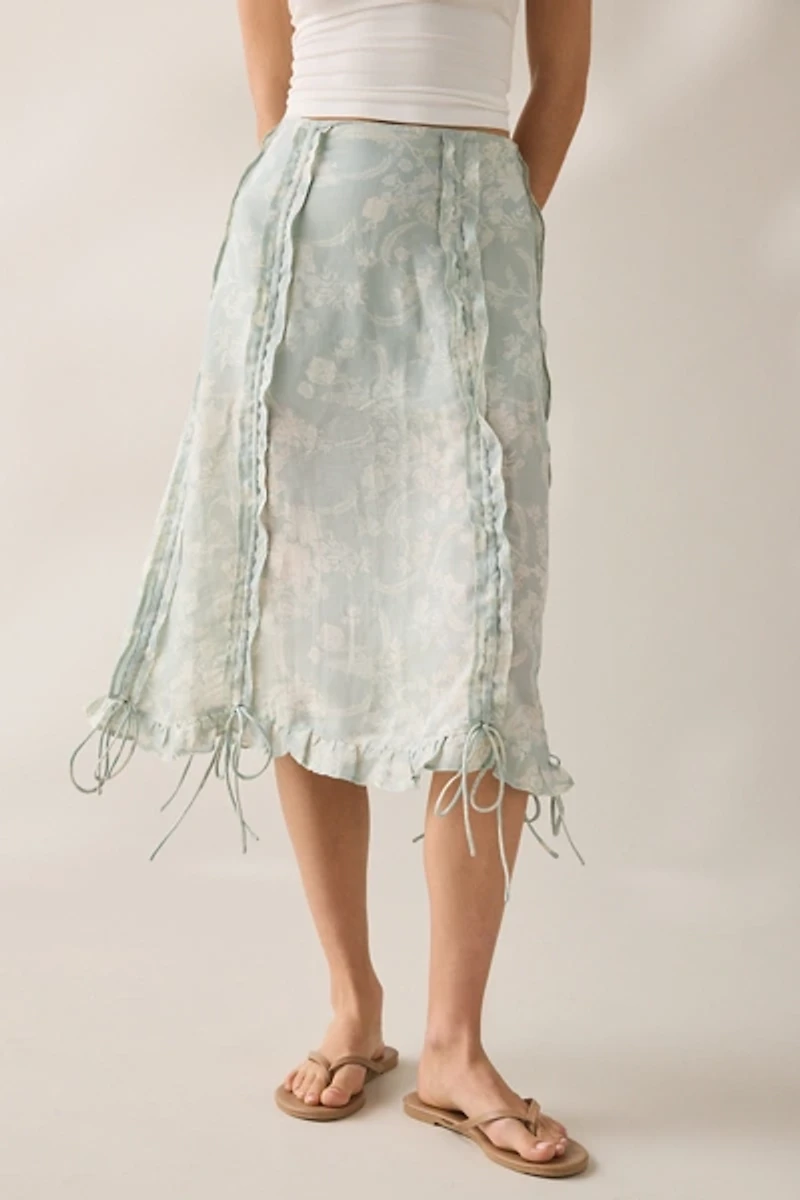 Femme floral Muse Assembly midi skirt in a swingy, a-line silhouette. Knee-length skirt featuring a mid-rise waistline, adjustable ruched tie details and ruffled hem for a romantic finish! Pairs perfectly with basic tees, blouses and going out tops for endless ways to wear.