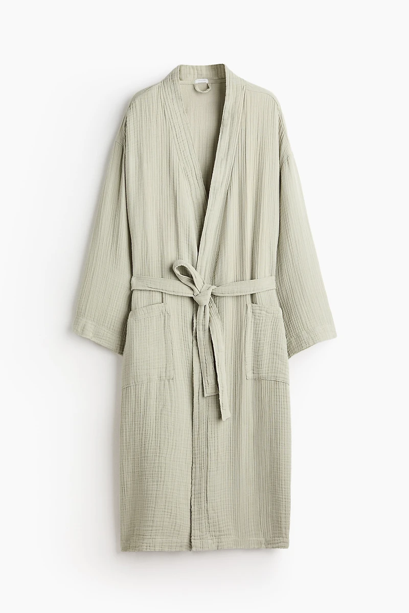 Bathrobe in soft cotton muslin. Shawl collar, removable tie belt at waist, and patch front pockets.