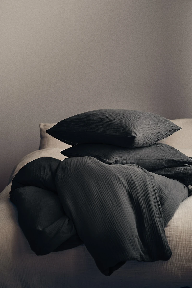 King/queen duvet cover set in soft cotton muslin that is cool and comfortable for sleeping. Duvet cover fastens at foot end with concealed metal snap fasteners. Two pillowcases with envelope opening. Thread count 250.