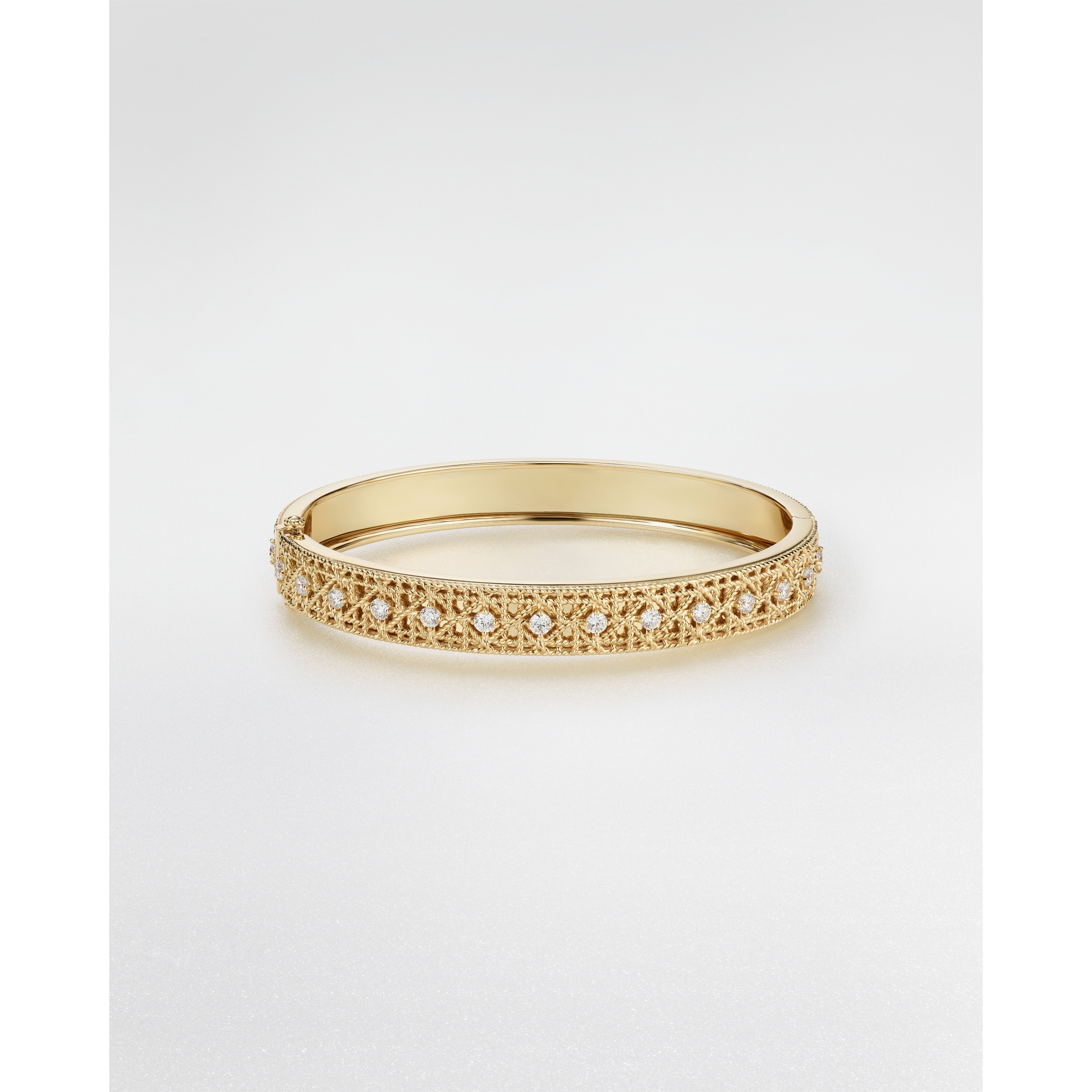 The My Dior collection by Victoire de Castellane is reinvented with a series of infinitely precious jewelry pieces. In an ode to the art of detail, a tangle of golden threads is woven together like meticulously interlaced sprigs of straw into a subtle mesh, revealing the iconic Cannage, accented by a strip of shiny gold. The craftsmanship is an homage to Dior's refined style.