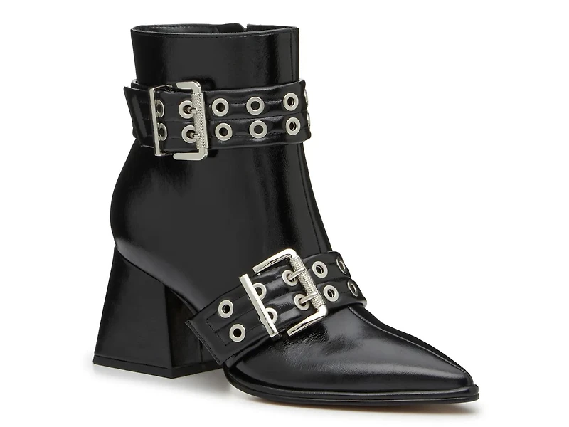 Go for a sleek style with edgy accents. The Naeve bootie from Mix No. 6 features chic details, including a solid block heel and a pointed toe. Complete with moto-inspired straps with silvertone buckles.