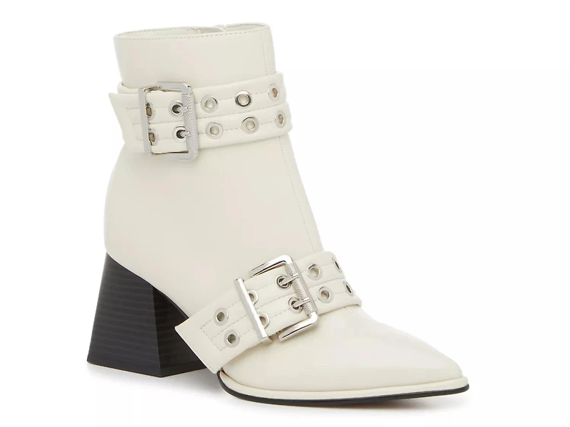 Go for a sleek style with edgy accents. The Naeve bootie from Mix No. 6 features chic details, including a solid block heel and a pointed toe. Complete with moto-inspired straps with silvertone buckles.