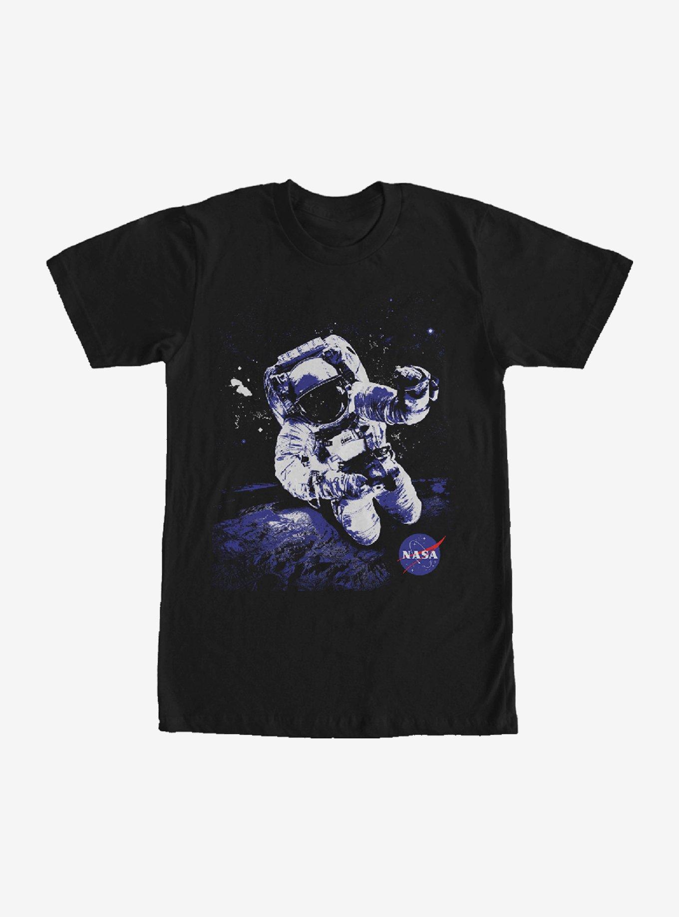 Make your home among the stars with this black distressed NASA tee. An astronaut is featured floating through the great abyss of space.