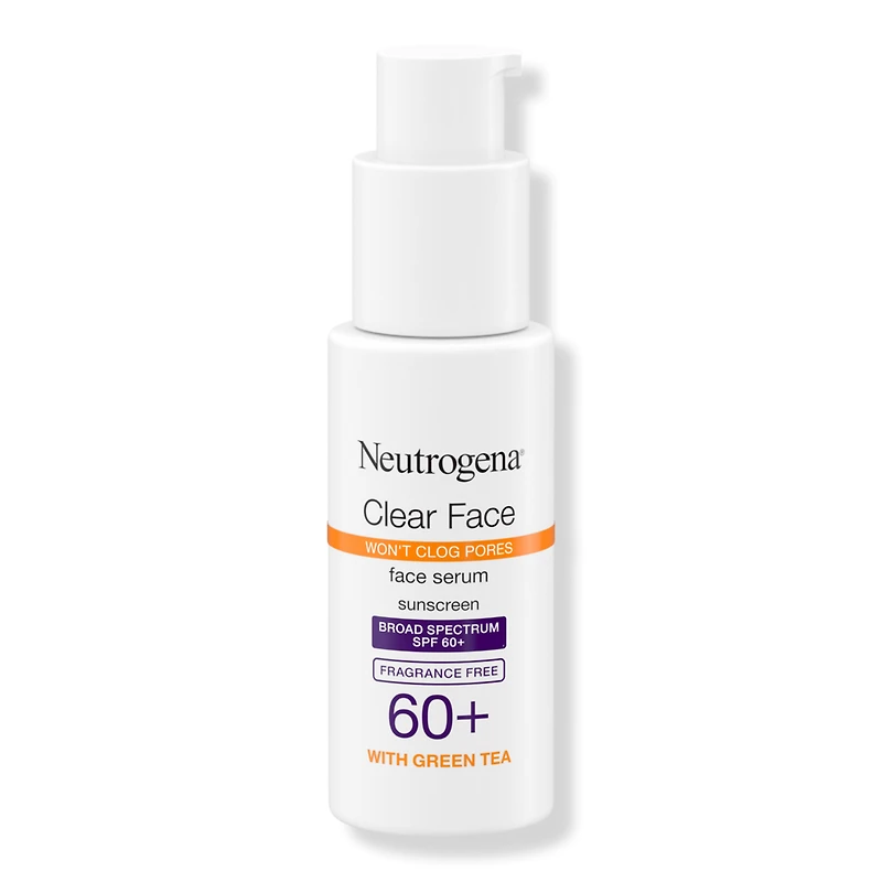 CLEAR FACE SERUM SPF 60 1.7OZ. Benefits: Neutrogena Clear Face Serum with green tea and broad spectrum SPF 60+ to help prevent sunburn. Non-comedogenic face sunscreen serum protects skin against the sun and won't clog pores. Lightweight, breathable facial sunscreen works as a makeup primer for smoother application. Helioplex technology helps prevent sunburn and provides broad spectrum UVA/UVB protection. Helps fight signs of aging, such as wrinkles, dark spots, and fine lines due to UV exposure. Non-greasy face serum is invisible on all skin tones and won't leave behind a white cast. Key Ingredients: Green tea serum with SPF leaves skin feeling soft and smooth while providing breathable protection. Formulated Without: Oxybenzone. Fragrance.