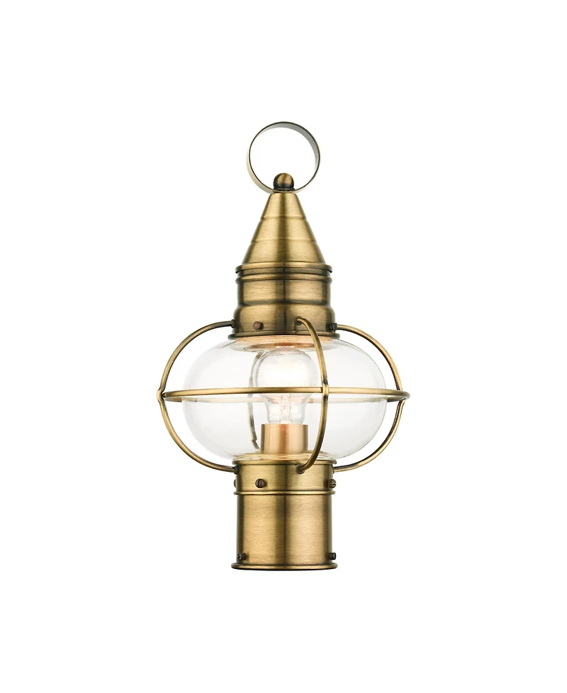 The Newburyport outdoor medium single-light post top lantern boasts classic nautical and railway styling. This piece features a beautiful hand-blown clear glass globe and an brass finish over the hand crafted solid brass construction.
