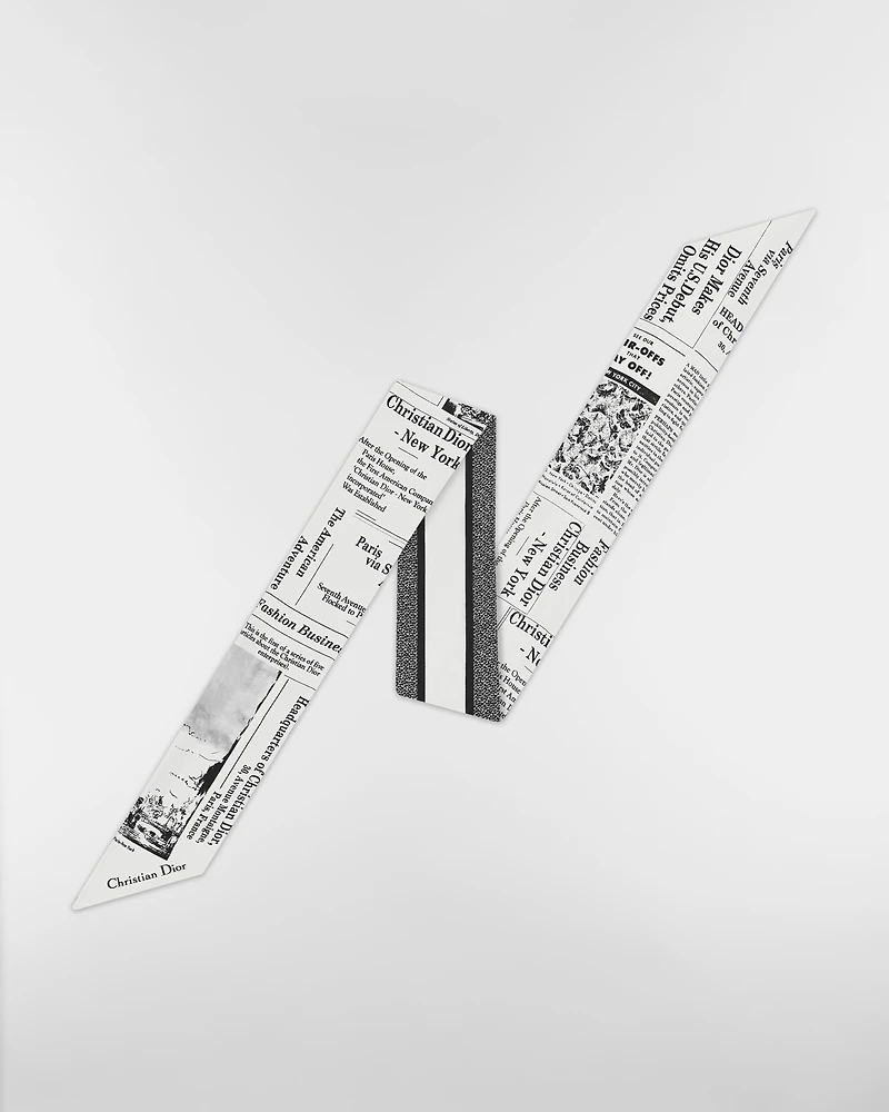 The white and black silk twill Mitzah scarf features the Newspaper print, inspired by House archives. The timeless elongated shape with pointed ends is embellished with a tonal Christian Dior signature jacquard band. The Mitzah will lend the finishing touch to any modern look and may be tied around the neck, at the wrist or on a bag.