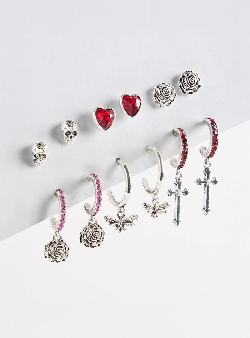 MATERIALS + CARE Man-made materials. Wipe clean with cloth. Imported. DETAILS High shine finish. Set of 6 pairs. Studs, hoops, and heart shaped. Rhinestone details. NIGHTFALL Mysterious. Evocative. Inspired by the romance of the night. Because beautiful things happen in the darkness.