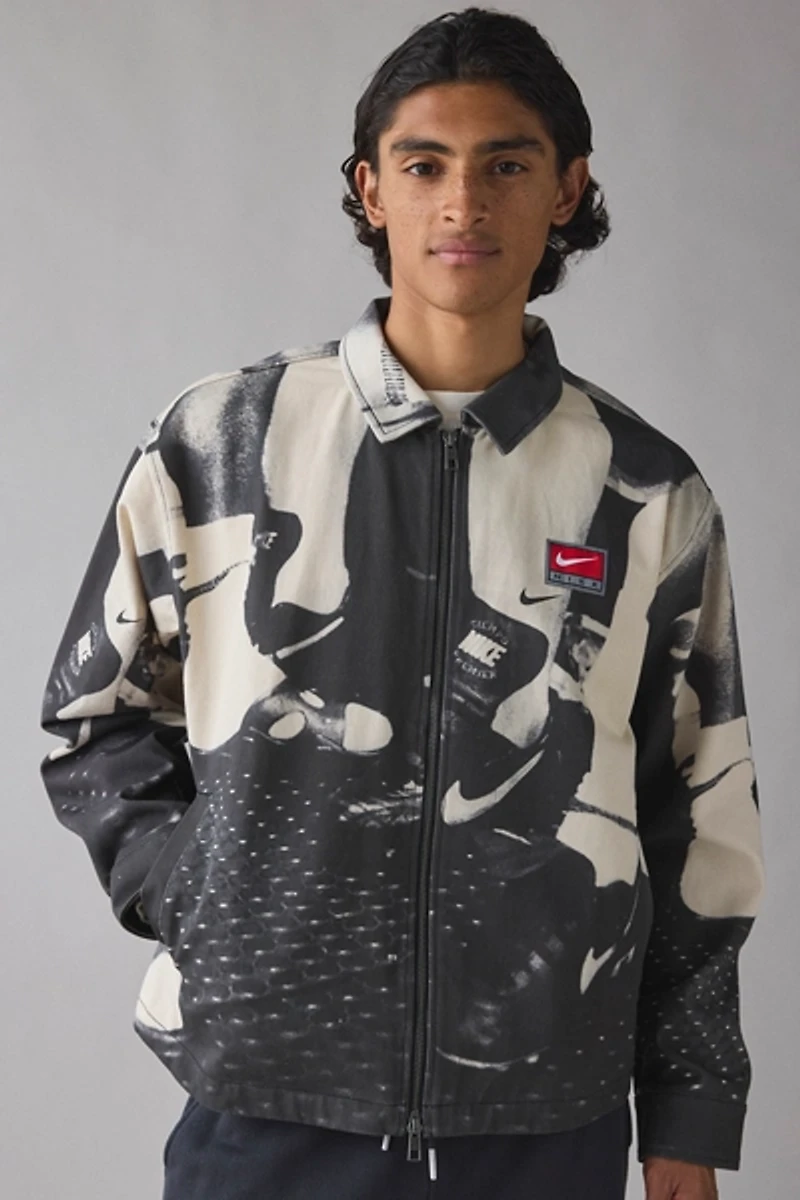 Classic field jacket by Nike with a bold allover graphic. Collared cotton jacket with a zippered front closure. Includes hand pockets and finished with button accents at the cuffs.