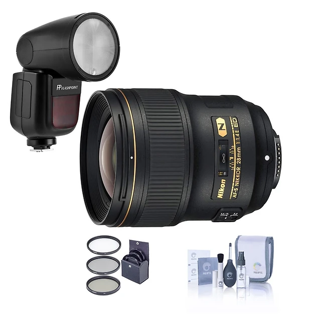 Nikon 28mm f/1.4E Af-s Nikkor Lens - Bundle with Flashpoint Zoom Li-on X R2 Ttl On-Camera Round Flash Speedlight, 77mm Filter Kit, Cleaning Kit