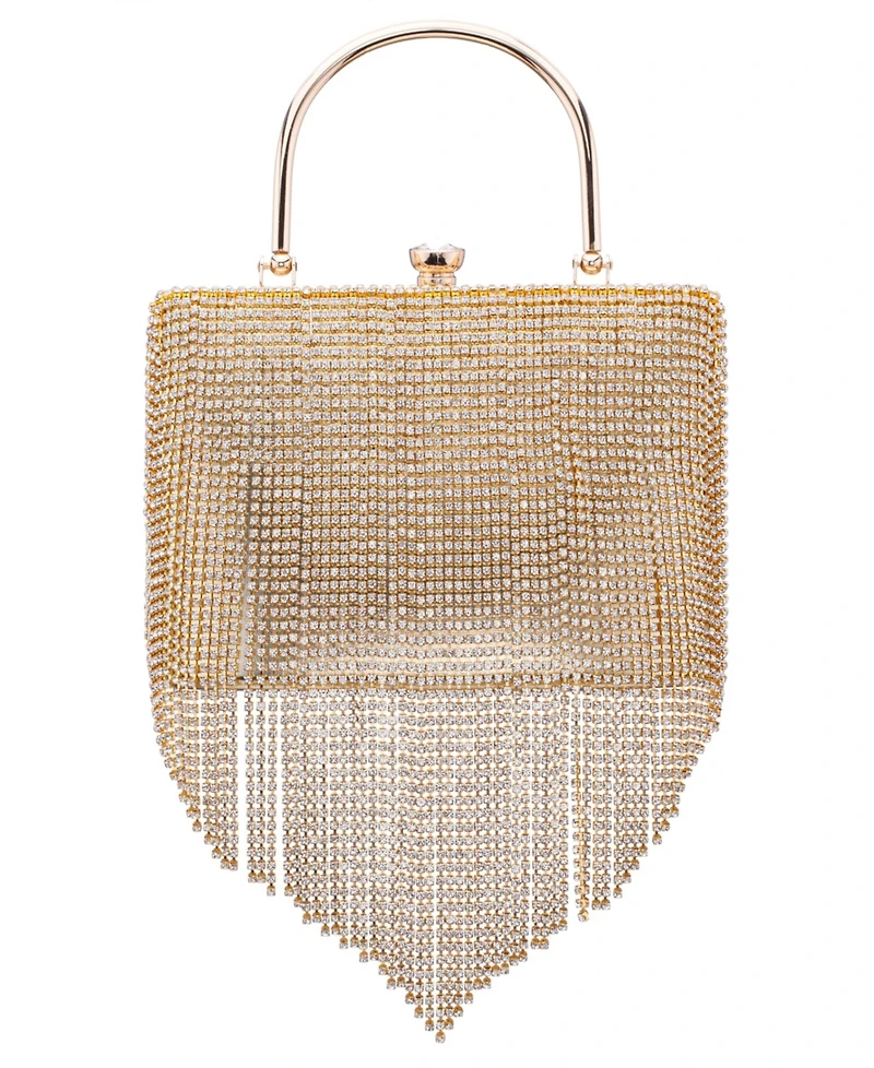 Make a statement with this cascading fringe crystal satchel with metal handle to old as well as include drop in chain for styling versatility