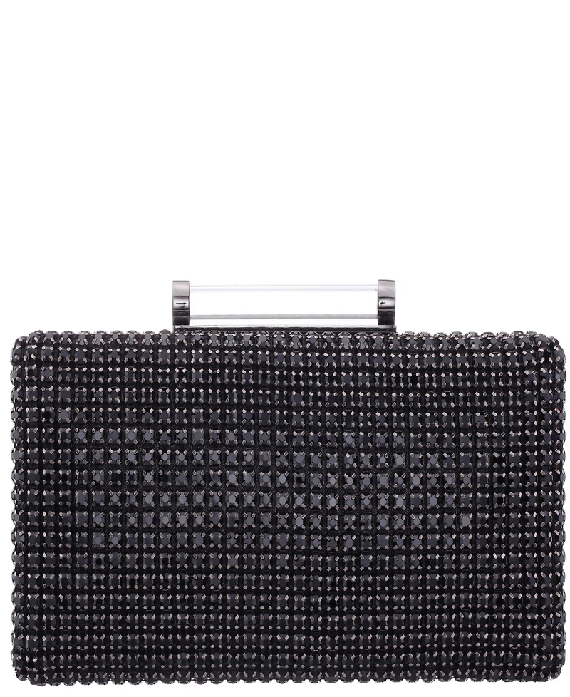 Gracious is a dazzling minaudiere, fully embellished with oversized crystals for a bold, glamorous look. It features a sleek metal and clear lift-lock closure and includes a drop-in chain strap for hands-free styling.