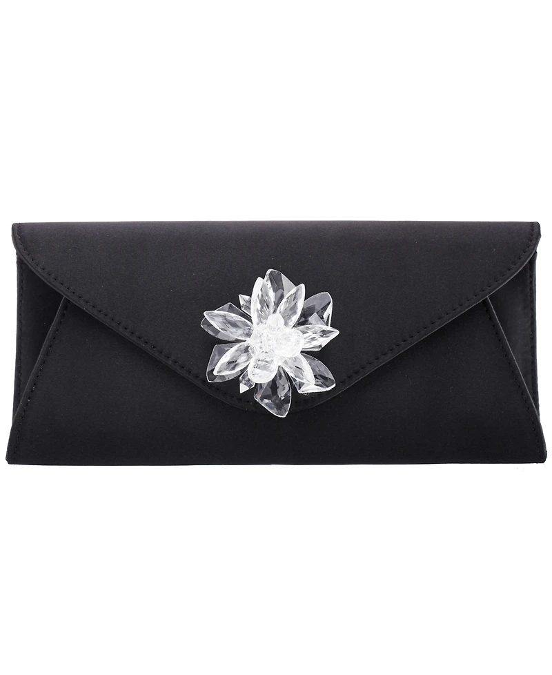 Twila is a envelope clutch that has a smooth satin body is adorned with a brilliant crystal cluster ornament-a dazzling focal point that elevates any special occasion look. Also includes drop in chain to go hands free.