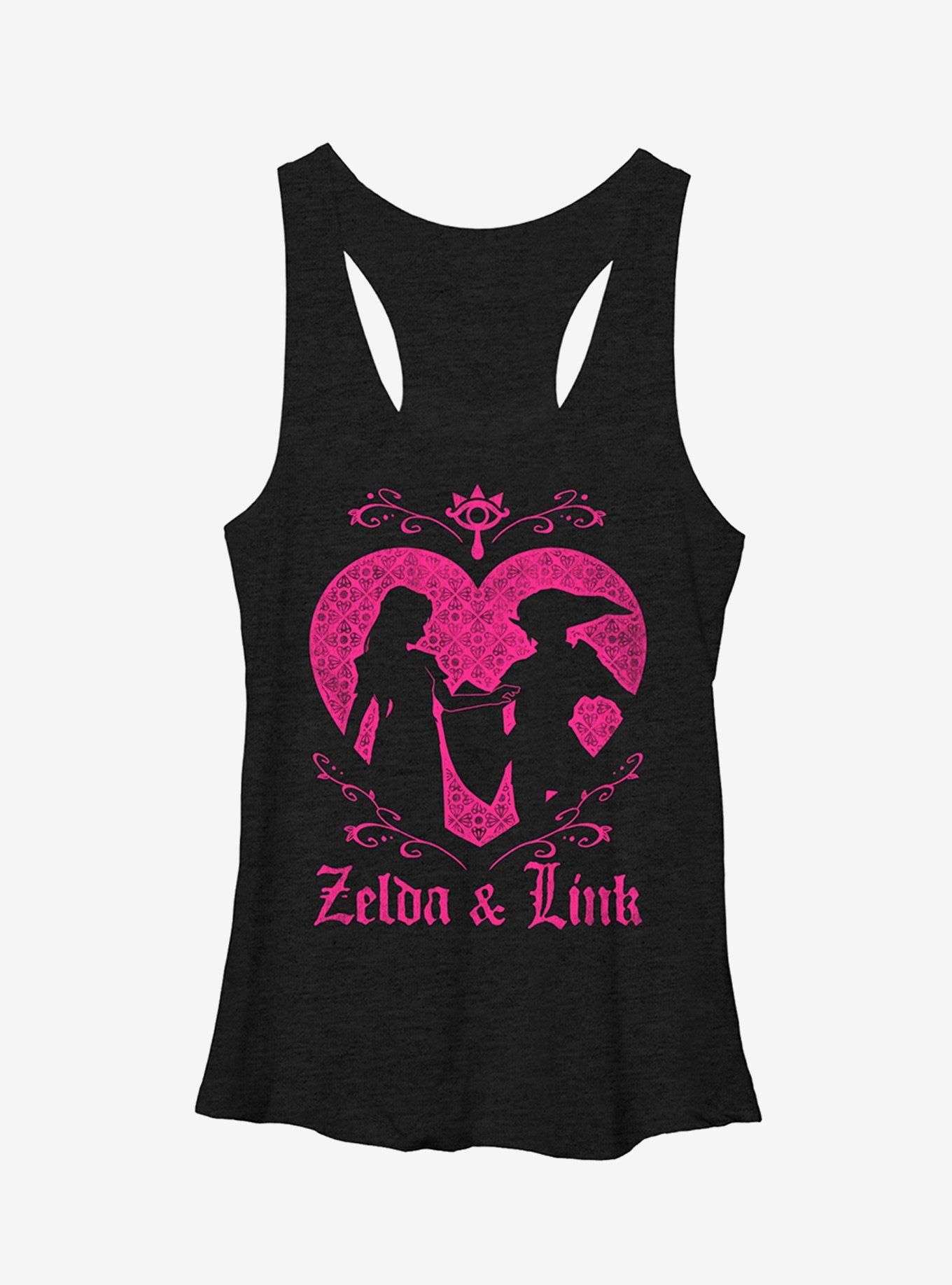 Celebrate adventures, heroes, and true love with the Nintendo Legend of Zelda Link Love Heather Black Racerback Tank Top! This soft and breathable black shirt reads "Zelda & Link" below a pink heart with the silhouettes of these two love birds. 50% Polyester, 25% Cotton, 25% Rayon. Designed with raw-edge hems.